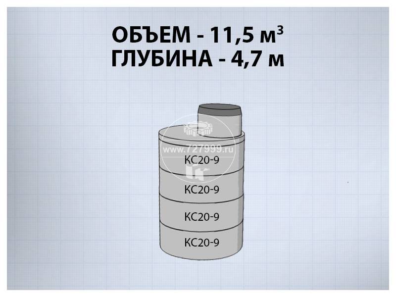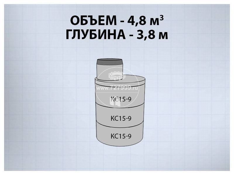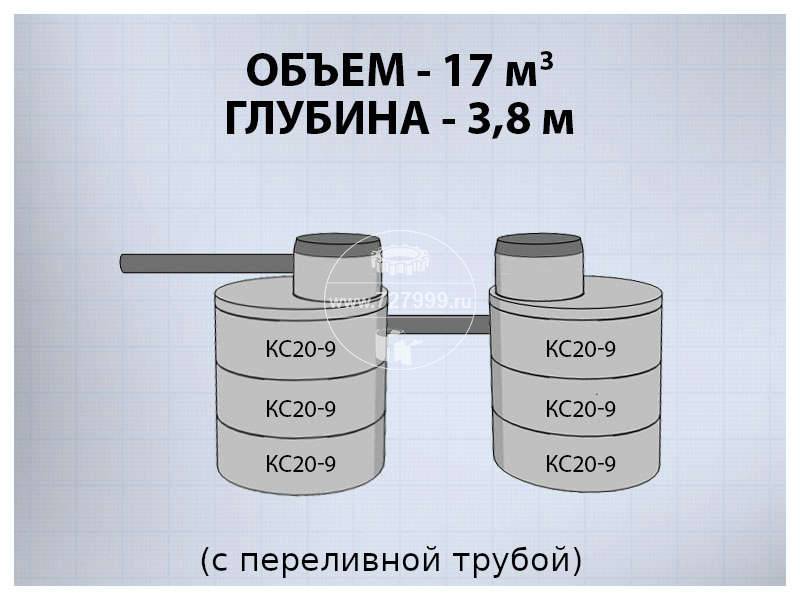 Необходимый объем выгребной ямы прямо пропорционален количеству сточных вод.В СНИП указано, что при расчетах объемов сточных вод, суточный расход воды на одного человека должен приниматься в количестве – 0,2 м куб. в сутки (200 л/сут). А объем рассчитывается исходя из 3-х дневного запаса. Если исходить из подобных требований, то минимальный объем для одного человека составляет 0,6 м куб. На семью из 4 человек — 2,4 м куб. С учетом донных отложений объем септика должен составлять — 2,7 м куб.